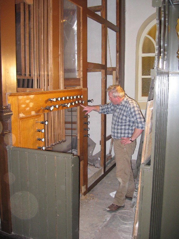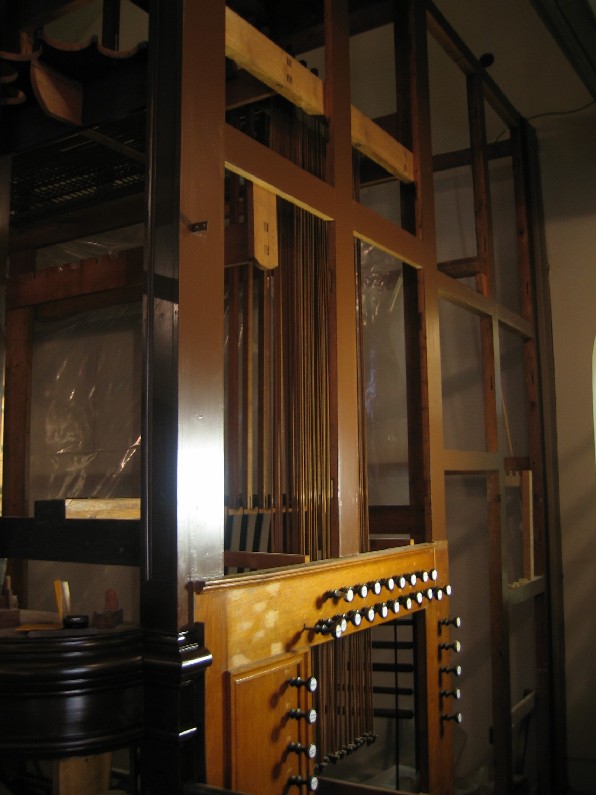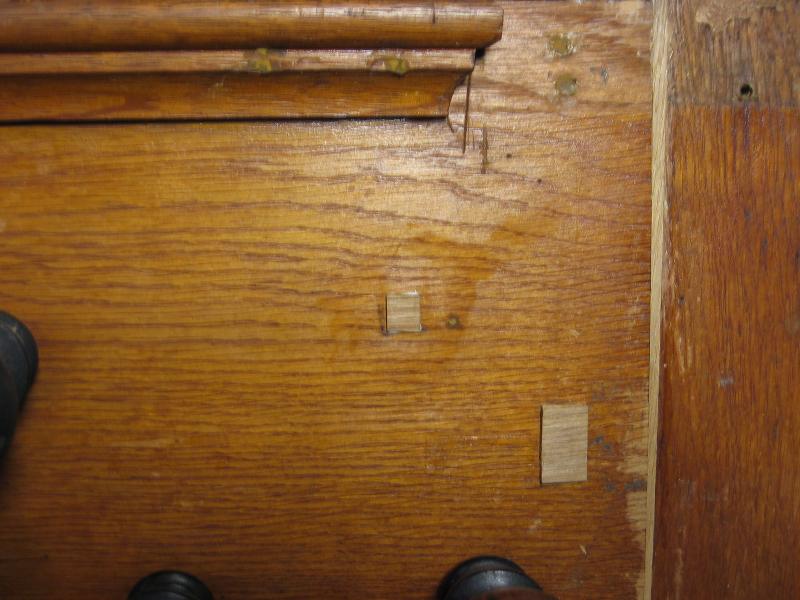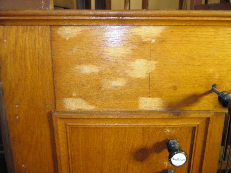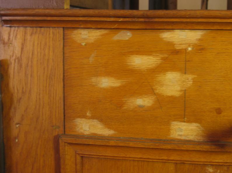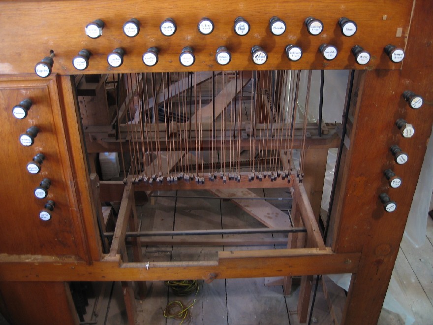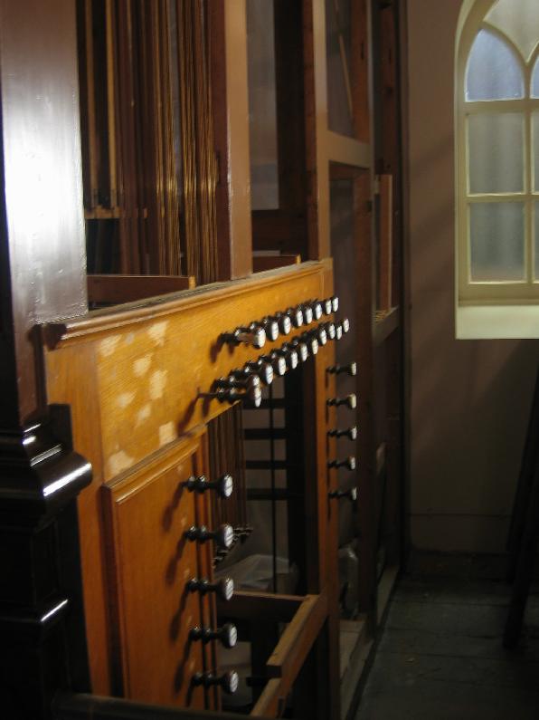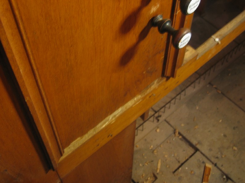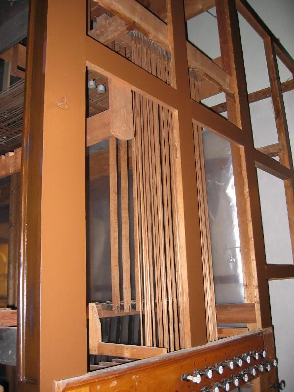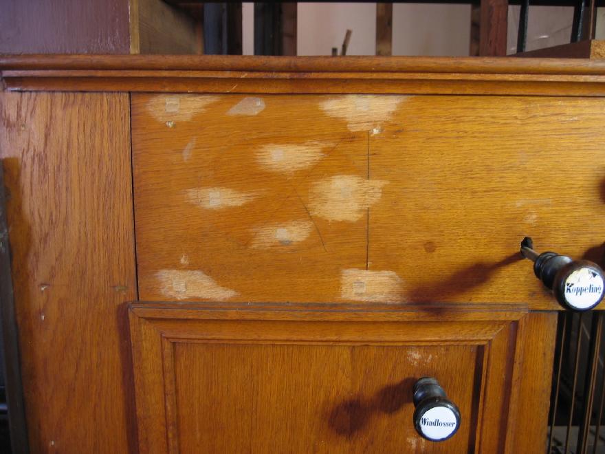 De eiken klaviatuurwand zonder opgeplakte cijfertjes en oude schakelaar..